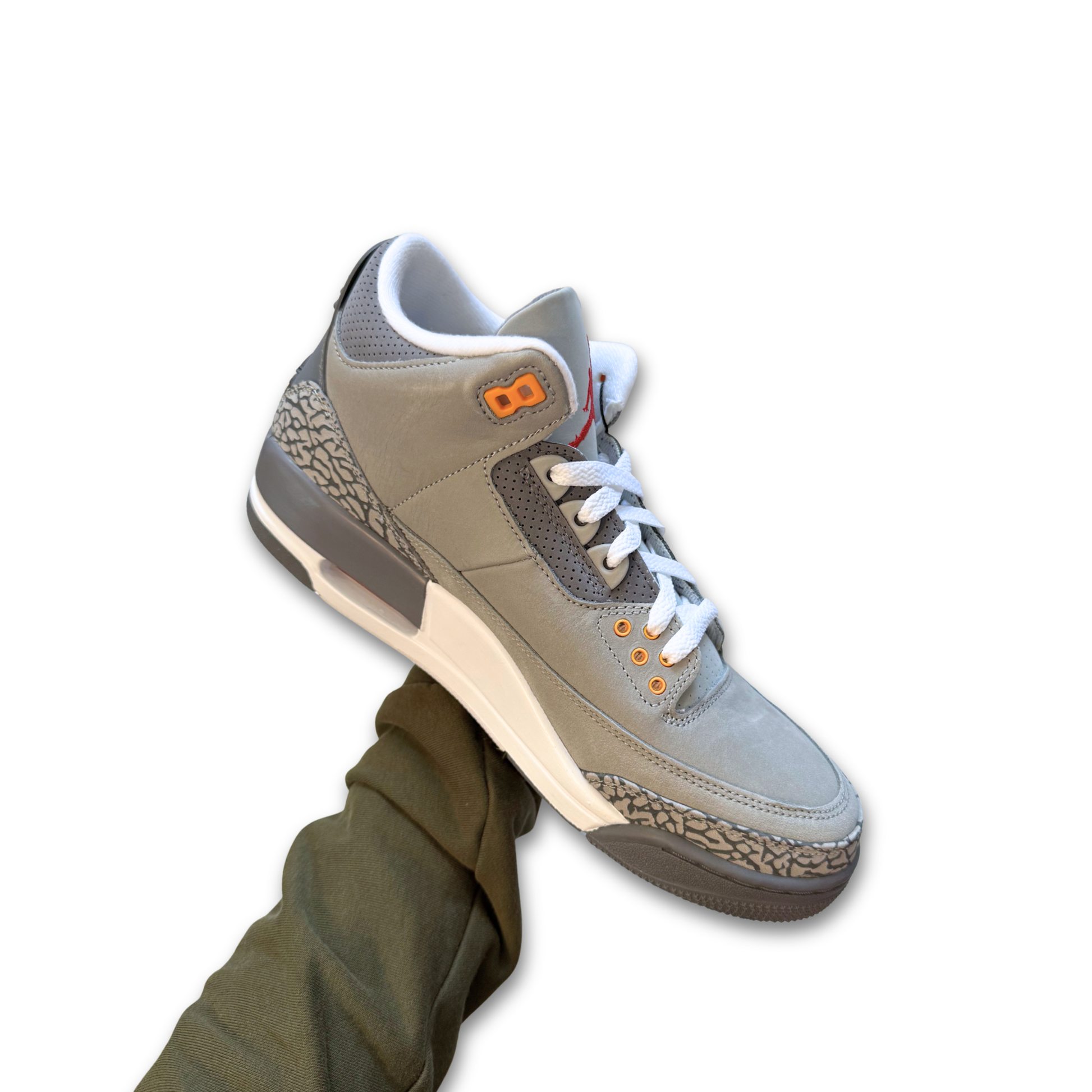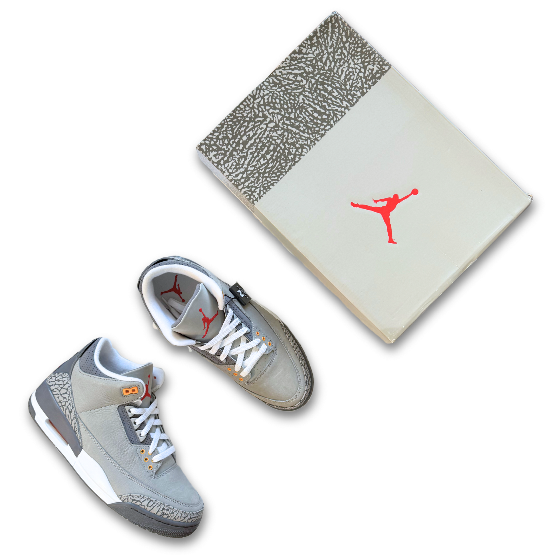 The upper of the Jordan 3 Cool Grey is constructed of a Cool Grey Durabuck with classic Elephant Print mudguards on the toe and heel. Hits of Sport Red and Orange Peel are located on the tongue, eyelets, Air bag, and heel tab. Instead of traditional "Nike Air" branding on the heel, this model stays true to its 2007 rendition and features a Jumpman logo. A white and dark grey sole completes this retro design.
